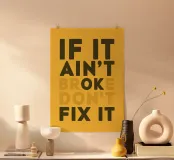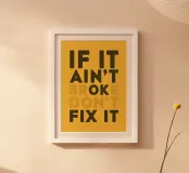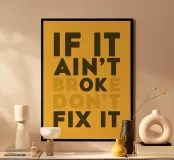 If It Ain't Broken, Don't Fix It" (Se non è rotto, non aggiustarlo) è inciso a caratteri d'epoca su una tavola di legno, evocando semplicità e saggezza.