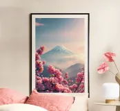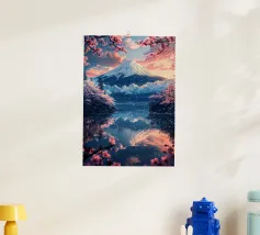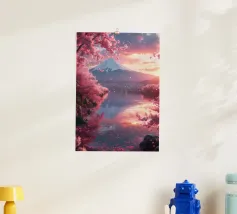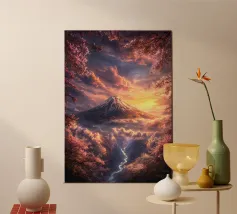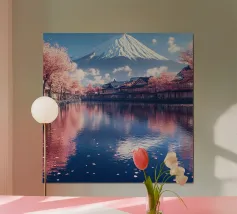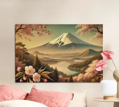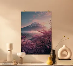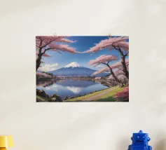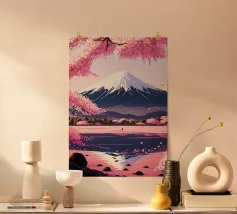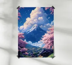 Una vista mozzafiato del maestoso Monte Fuji che si staglia nel cielo limpido di primavera. In primo piano, delicati fiori di ciliegio (sakura) danzano nel vento, conferendo alla scena una poetica leggerezza. La combinazione tra la forza della natura e la bellezza dei fiori simboleggia la transitorietà, l'armonia e il profondo legame tra la cultura giapponese e la natura. Questa immagine cattura perfettamente la magia della stagione della fioritura dei ciliegi, ideale per opere d'arte da parete, calendari o diari di viaggio. Suggerimento: perfetto per tutti coloro che sognano di viaggiare o che vogliono portare un pezzo di tranquillità e di estetica giapponese nella loro casa.