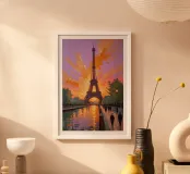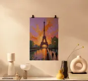 Questo dinamico dipinto impressionista raffigura la Torre Eiffel che risplende sotto un vibrante tramonto. Il gioco di luci e ombre crea una straordinaria gamma di colori, dal giallo oro al viola intenso. Le pennellate strutturate conferiscono profondità al cielo, mentre il riflesso scintillante del canale esalta l'armonia della composizione. Incorniciata da alberi e strade parigine, la torre rimane il fulcro, rappresentando il fascino senza tempo della capitale francese.