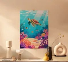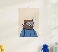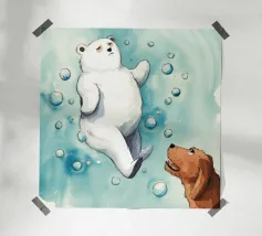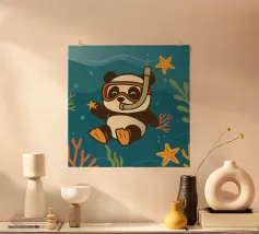 Simpatico orso con occhiali da sub che nuota nel mare. Scena subacquea giocosa con coralli e stelle marine. Perfetto per disegni per bambini, prodotti estivi e illustrazioni marittime.Orso allegro con maschera da snorkeling Mondo sottomarino colorato con sole Design infantile e giocoso Ideale per motivi estivi, marini e animali Perfetto per poster, abbigliamento...