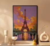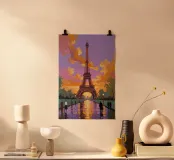 Questo vibrante dipinto a olio impressionista cattura la Torre Eiffel che si staglia su un tramonto ipnotico. Le striature di viola, arancio e oro dominano il cielo, con la loro ricca texture che aggiunge profondità ed emozione alla scena. In basso, il riflesso della torre luccica sui sentieri bagnati, creando un senso di tranquillità. Le sagome dei pedoni passeggiano con disinvoltura, incarnando la tranquilla atmosfera parigina. Il gioco di luci e ombre sulla torre e sugli alberi racchiude perfettamente il fascino iconico di Parigi al tramonto.