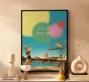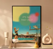 Donna che fotografa un uomo in procinto di saltare in piscina. Cielo aura sfumato e citazione 'Non è così profondo'. Surreale design retrò con piscina di motel vintage di MsGonzalez