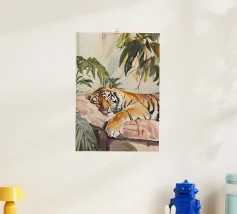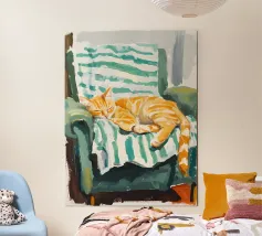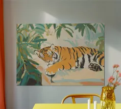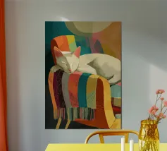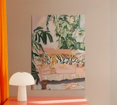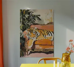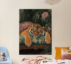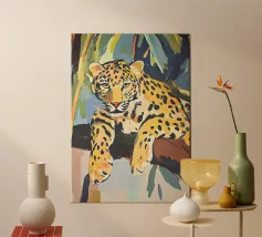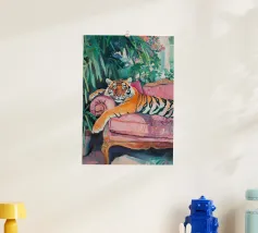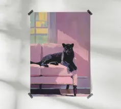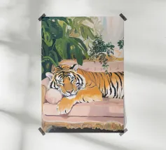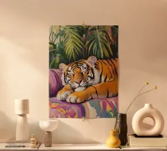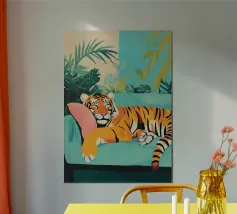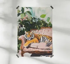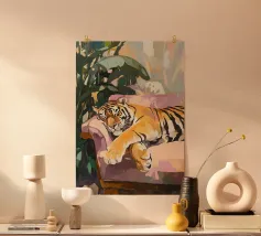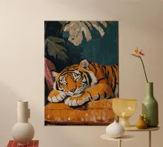 Un'opera d'arte serena e stravagante di un ghepardo che sonnecchia pacificamente su un divano vintage a righe bianche e verdi. I motivi vivaci e la postura accogliente del grosso felino creano un contrasto sognante e spiritoso tra la natura selvaggia e la rilassata vita domestica. Perfetto per gli amanti degli animali, i collezionisti d'arte eclettica e gli appassionati di estetica d'interni giocosa.