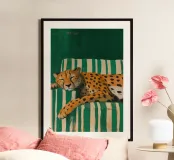 Un'opera d'arte serena e stravagante di un ghepardo che sonnecchia pacificamente su un divano vintage a righe bianche e verdi. I motivi vivaci e la postura accogliente del grosso felino creano un contrasto sognante e spiritoso tra la natura selvaggia e la rilassata vita domestica. Perfetto per gli amanti degli animali, i collezionisti d'arte eclettica e gli appassionati di estetica d'interni giocosa.