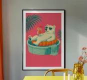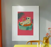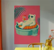 Un'illustrazione stravagante e vivace di un orso polare che vive la sua vita migliore: occhiali da sole, cocktail nella zampa e galleggiante in una piscina per bambini con una mini cascata. Su uno sfondo tropicale rosa caldo, quest'opera d'arte dona un tocco di umorismo e vibrazioni rilassanti a qualsiasi spazio. Perfetto per gli amanti dell'arte eccentrica, dell'estetica retrò e dell'atteggiamento rilassato. Che sia per il salotto, l'ufficio o la casa estiva, questo pezzo garantisce sorrisi.