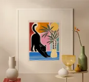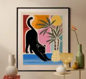 arte gatto nero, stampa gatto tropicale, poster astratto giungla, arte da parete animale moderna, illustrazione natura colorata, decoro felino audace, arte fauna minimalista, opera d'arte foglie tropicali, poster sole vibrante, decoro giungla boho, arte vaso geometrico, design gatto contemporaneo, stampa animale esotico, scena tropicale astratta, poster gatto artistico, decoro casa elegante, silhouette animale giungla, stampa moderna colorata, opera d'arte palma, arte tramonto giungla