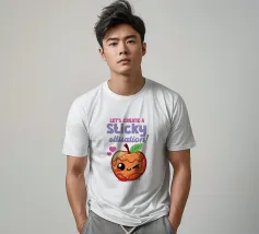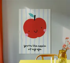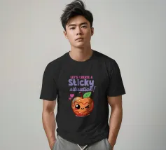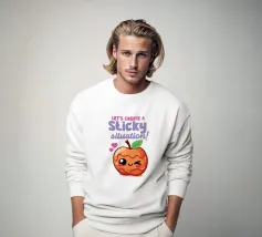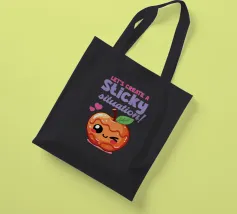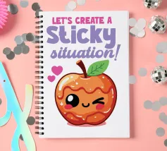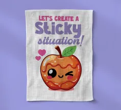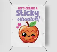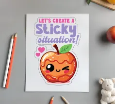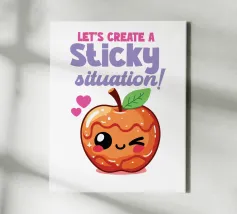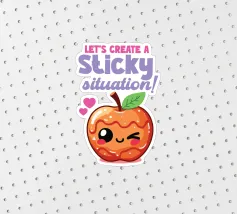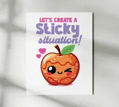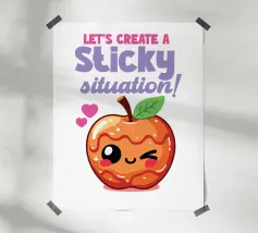 Una simpatica mela dei cartoni animati ricoperta di caramello ammicca giocosamente, accompagnata da due cuori rosa. Il testo recita: "Creiamo una situazione appiccicosa!".