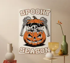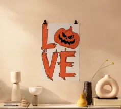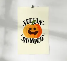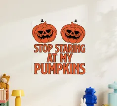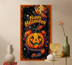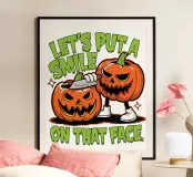 Due zucche maliziose con ghigni minacciosi. La frase "Let's put a smile on that face" (mettiamo un sorriso su quella faccia) è riportata in grassetto, a caratteri scherzosi.