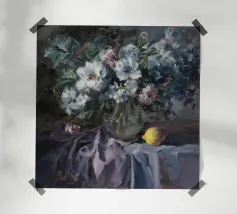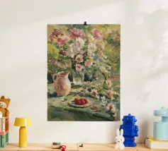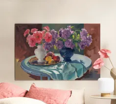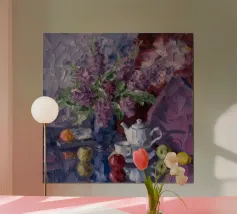 Una natura morta con una brocca d'argento riempita con un rigoglioso bouquet di lillà viola e rosa. Un bicchiere di vino rosso e della frutta si trovano su una superficie scura e lucida che riflette gli oggetti.