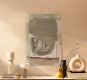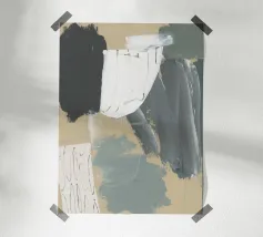 Astrazione gestuale e giocosa di aree di colore libere e linee disegnate in tonalità calde e morbide di verde chiaro, verde kaki, marrone rossiccio, beige e grigio. Un'opera di astrazione gestuale non convenzionale ed espressiva.