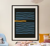 Scoprite questo accattivante poster astratto con una composizione audace e minimalista. Il disegno presenta linee orizzontali blu leggermente ondulate su uno sfondo nero opaco, evocando un senso di calma e struttura. La composizione è bruscamente interrotta da un'unica, vibrante barra giallo senape sulla sinistra, che crea un potente punto focale visivo e un contrasto dinamico. Questo pezzo incarna perfettamente la semplicità geometrica e la tavolozza di colori del design del Mid-Century Modern. Riceverete un file digitale premium da scaricare (7000x5000 pixel, 300 dpi) per una stampa di alta qualità che farà la felicità di tutti.
