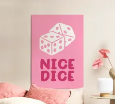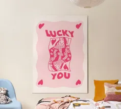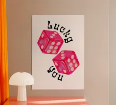Due dadi rossi sono posizionati sotto la frase giocosa "lucky you" scritta in corsivo. Il design combina la semplicità con un messaggio positivo e stravagante.