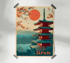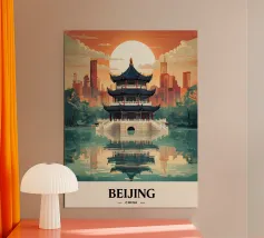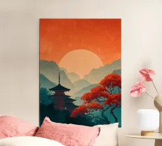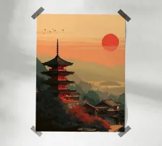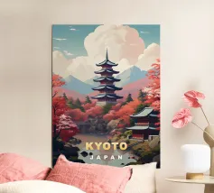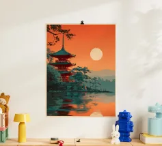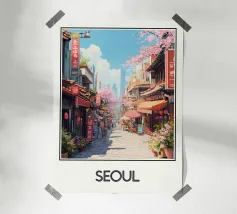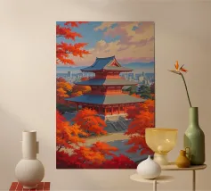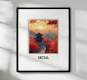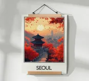 Immergetevi nell'atmosfera poetica di Seoul in autunno con questo poster che raffigura un padiglione tradizionale circondato da un fogliame rosso fiammeggiante, con la sagoma della città moderna all'orizzonte. Una perfetta armonia tra natura e urbanistica.