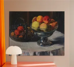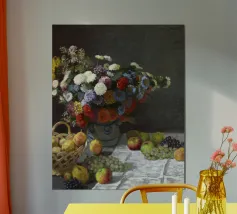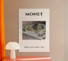 Un'affascinante natura morta del maestro impressionista Claude Monet, che mette in mostra la tranquilla eleganza degli oggetti quotidiani Presenta una disposizione rustica di mele e uva su un tavolo rivestito di bianco, immerso in una morbida luce naturale Cattura la bellezza fugace della frutta matura con pennellate sciolte e tonalità calde e autunnali Un'opera intima che si discosta dai famosi paesaggi di Monet e che è stata dipinta in casa durante il maltempo. Un'opera d'arte senza tempo e rilassante, perfetta per cucine, sale da pranzo o qualsiasi altro interno accogliente Regalo ideale per gli amanti dell'arte, per i cuochi o per chi apprezza l'estetica rustica e la natura morta