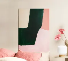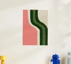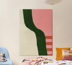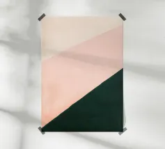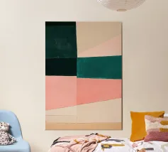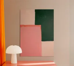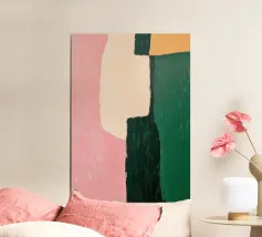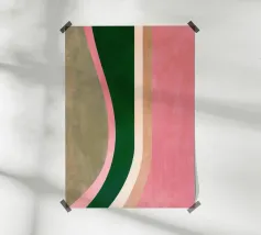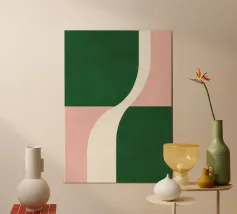 Blocchi di colore minimalisti rosa, verdi e bianchi su uno sfondo color salvia, realizzati con colori acrilici.