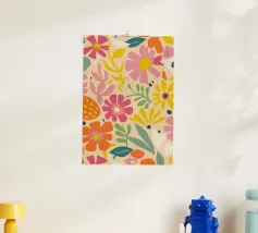 Una composizione astratta giocosa e colorata con una serie di forme organiche simili a blob di varie dimensioni e tonalità. La disposizione stravagante e la tavolozza vibrante creano un senso di gioia spontanea e libertà artistica.
