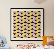 I motivi geometrici si ripetono in un design simmetrico, caratterizzato da triangoli e rettangoli nei colori nero, giallo e rosa. La disposizione strutturata crea una composizione ordinata e di grande impatto visivo.