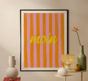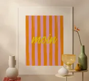 Scoprite il design allegro ed energico "MOIN - North German joie de vivre". Questo poster accattivante combina audaci strisce verticali in arancione e rosa con l'affascinante scritta "MOIN" in calligrafia gialla e ricurva. Le strisce hanno una texture leggermente irregolare e dipinta che conferisce al disegno un tocco artistico e giocoso. La parola "MOIN", un noto saluto della Germania settentrionale, è al centro dell'attenzione e conferisce al disegno un'atmosfera amichevole e invitante.