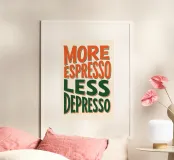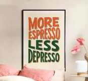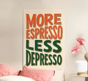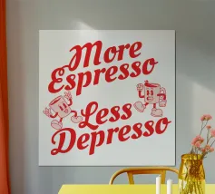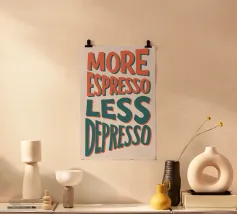 Un poster umoristico per tutti gli amanti della caffeina: "More Espresso, Less Depresso" porta il buon umore e una strizzatina d'occhio a qualsiasi parete. Con il suo aspetto disegnato a mano in arancione e verde scuro, è perfetto per la cucina, l'ufficio o il bar. Sia che si tratti di un regalo per i drogati di caffè o di un inizio di giornata motivante, questo poster è garantito per risollevare l'umore.