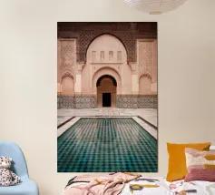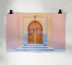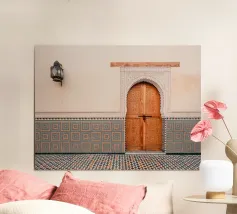 Architettura marocchina in colori pastello. Piante botaniche, porta, piastrelle e parete color pastello.