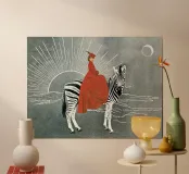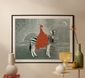 Dipinto vintage di una donna in elegante abito rosso che cavalca la sua zebra verso l'orizzonte al tramonto. Collage a tecnica mista di MsGonzalez