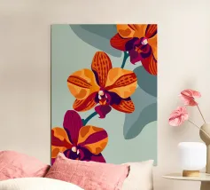 Un'illustrazione splendidamente dettagliata cattura l'eleganza di un'orchidea in fiore, con vibranti petali rosa, bianchi e gialli contrapposti a foglie blu intenso.