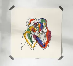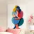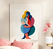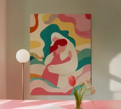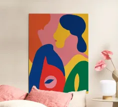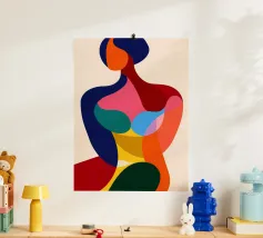 Una composizione astratta stilizzata presenta forme sovrapposte dai colori vivaci, che danno l'impressione di una persona seduta. L'uso audace di blu, rosso, arancione e verde acqua crea un senso dinamico di movimento e forma.