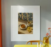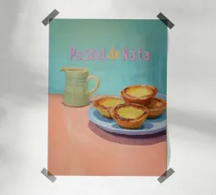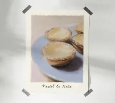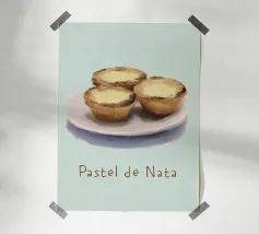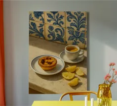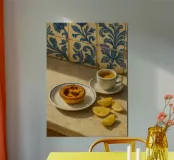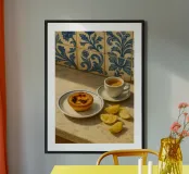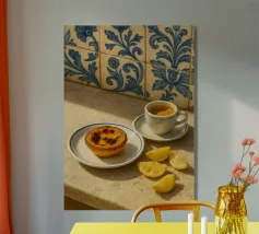 Un piattino bianco e croccante contiene un pastel de nata dorato e sbiancato, il cui centro di crema pasticcera cattura il sole del mattino come un vetro mielato. Accanto, una tazzina da caffè espresso proietta un'ombra morbida sul marmo cremoso. Incorniciato dagli iconici azulejos di Lisbona, Pastéis and Espresso distilla l'intimità di una lenta mattina d'estate in due perfetti bocconi di calore e rituale.