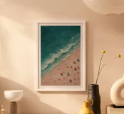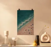 Questo sereno disegno aereo presenta una scena di spiaggia dai toni pastello, punteggiata da ombrelloni multicolori e piccoli bagnanti sparsi sulla sabbia soffice. Le delicate onde verde acqua rotolano in strati ritmici lungo la riva, creando uno sfondo rilassante per il rilassato tableau estivo. La tavolozza pastello e la texture pittorica conferiscono all'immagine una qualità sognante, quasi impressionistica. Ideale per camere da letto, studi o uffici, questa stampa genera un senso di serena nostalgia vacanziera e di estro artistico. Perfetta per tutti coloro che amano la dolce bellezza del mare e le sottili armonie di colore.