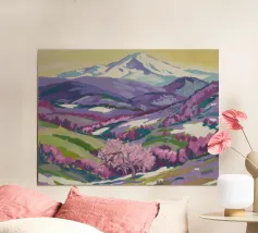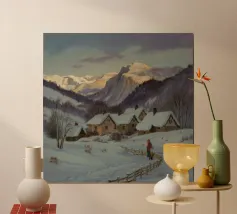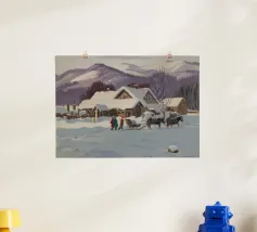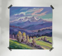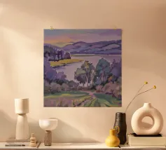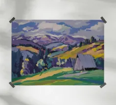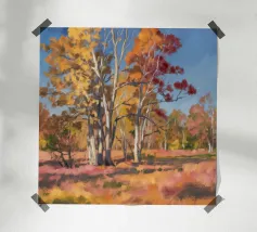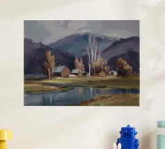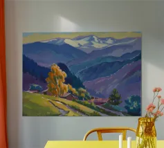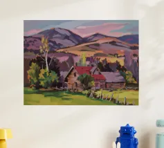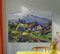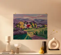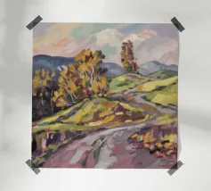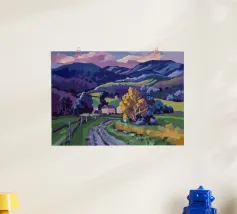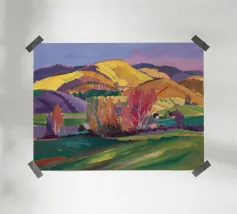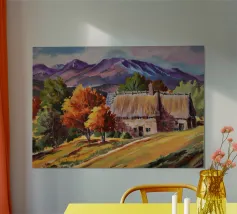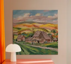 Un pittoresco paesaggio autunnale che raffigura un villaggio o una fattoria adagiata su una collina, circondata da un mosaico di alberi colorati nei toni dell'arancione e del giallo e da campi coltivati, con le lontane montagne blu a completare la scena.