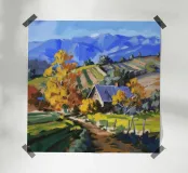 Un pittoresco paesaggio autunnale che raffigura un villaggio o una fattoria adagiata su una collina, circondata da un mosaico di alberi colorati nei toni dell'arancione e del giallo e da campi coltivati, con le lontane montagne blu a completare la scena.
