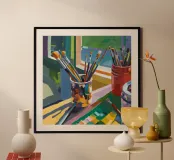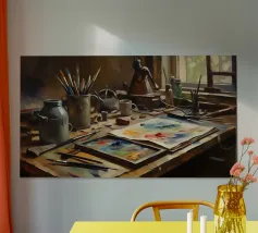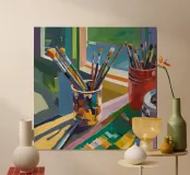 Un vivace barattolo di pennelli si trova alla luce del sole su un tavolo da studio, traboccante di potenziale artistico.