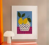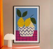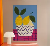 Una moderna natura morta di due pere gialle in una ciotola con un audace motivo a zig zag in bianco e nero. Lo sfondo a scacchi rosa e viola aggiunge un ulteriore livello di grafica giocosa alla composizione.