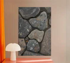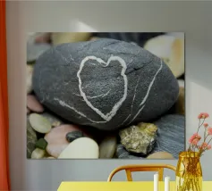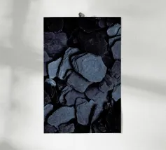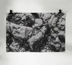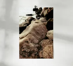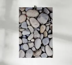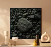 Rocce di varie forme e dimensioni sono adagiate su una spiaggia, con un'attenzione particolare a una pietra unica e strutturata. L'ambiente appare tranquillo, con la luce del crepuscolo che mette in risalto il paesaggio naturale.