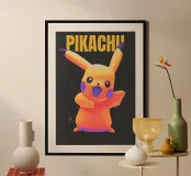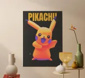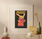 Un'immagine luminosa di Pikachu in stile neon con un'espressione allegra e un testo giallo in grassetto.