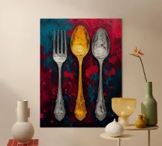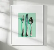 Elegante acquerello di forchetta coltello e cucchiaio con riflessi su sfondo verde menta. Arte da parete minimalista per la cucina, adatta a sale da pranzo, caffè e spazi culinari moderni.