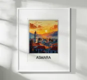 Immergetevi nell'incantevole atmosfera della capitale eritrea con questa pittoresca vista di Asmara al tramonto. I tetti rossi, le palme e le montagne circostanti si fondono in calde tonalità dorate, rivelando tutto il fascino di questa città unica.
