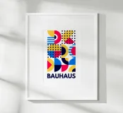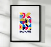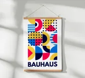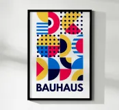 Un poster astratto incredibilmente vibrante e complesso, che abbraccia pienamente lo spirito del movimento Bauhaus con il suo uso di colori primari (rosso, giallo, blu) e forme geometriche fondamentali. La composizione è un collage dinamico di cerchi, semicerchi ed elementi a fantasia, tra cui pois e strisce orizzontali, il tutto su uno sfondo bianco. L'intricata disposizione crea un senso di gioioso movimento e densità visiva. La parola "BAUHAUS" è visualizzata in grassetto in basso in blu navy. Questo file digitale ad alta risoluzione (7000x5000 pixel, 300 dpi) garantisce un'incredibile precisione dei colori e un'ottima qualità di stampa.