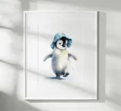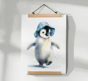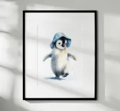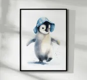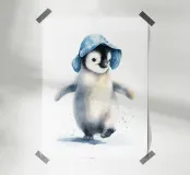 Poster acquerellato per cameretta con un adorabile pinguino che indossa un cappello blu. Un'illustrazione toccante e allegra che aggiunge freschezza e morbidezza alla decorazione murale della cameretta di un neonato o di un bambino.