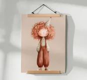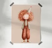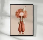 Questo allegro poster per la cameretta di un bambino presenta un adorabile clown dai capelli rossi e ricci, che indossa pantaloni con bretelle e un cappello da festa a righe. Realizzata in un delicato stile acquerello, questa illustrazione aggiunge un tocco di estrosità e divertimento a qualsiasi decorazione murale. Ideale per la cameretta di un bambino o di una bambina, stimola l'immaginazione e crea un'atmosfera giocosa e colorata. Un poster originale perfetto per un mondo divertente e poetico.