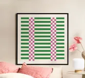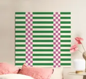 Quadri e linee viola e verde smeraldo su uno sfondo bianco brillante conferiscono a questo disegno un tocco festoso e giocoso. Ideale per aggiungere energia gioiosa e un tocco di moderno eclettismo al vostro arredamento.
