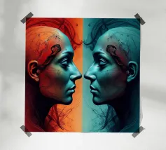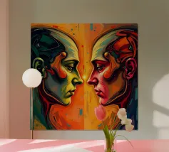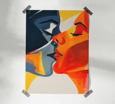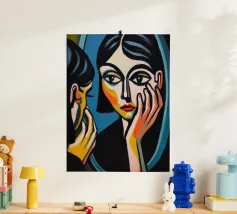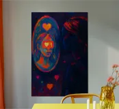 Una figura guarda in uno specchio ornato che riflette un cuore al neon e il badge di notifica "1" al posto del proprio volto. Audaci pennellate di magenta, arancione e blu elettrico incorniciano la scena, mescolando critica e ironia. Questo vivace commento alla cultura dei social media interroga la fame di approvazione esterna e l'erosione dell'identità personale sotto le icone di tendenza. Stampata su carta opaca di qualità da galleria, l'illustrazione, con il suo contrasto netto e le sue linee dinamiche, richiede attenzione in qualsiasi ambiente contemporaneo, come uffici, salotti o mostre d'arte digitale, e stimola la conversazione sul nostro sguardo digitale collettivo.