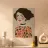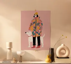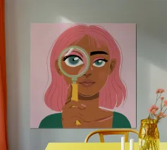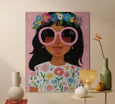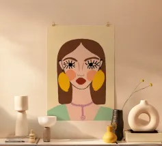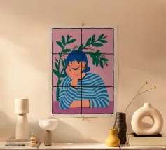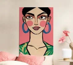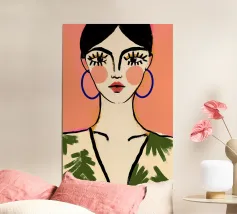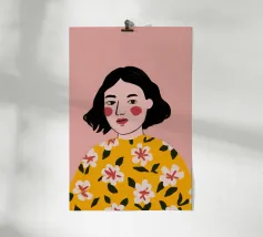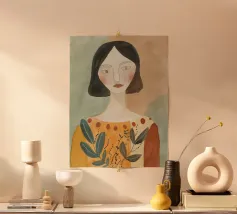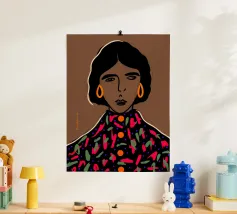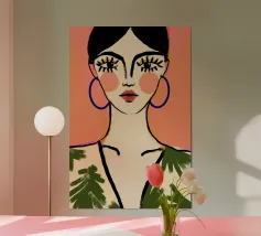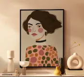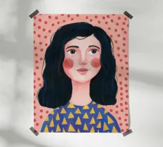 Il dipinto raffigura una persona con capelli corti e scuri acconciati a onde, che indossa un abito con motivi retrò e cerchi e diamanti nei toni del rosa, del marrone e del beige. Lo sfondo è di un semplice colore beige chiaro.