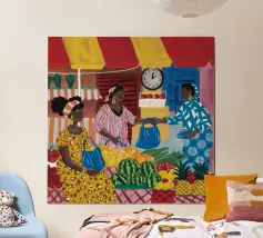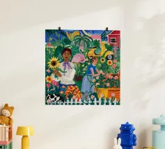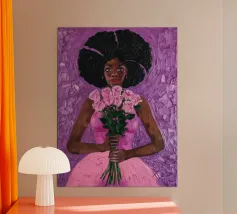 Questa opera d'arte mostra una persona seduta su una sedia a righe, circondata da girasoli e da una borsa verde. Lo sfondo è di un marrone tenue che crea un'atmosfera rustica e riflessiva.