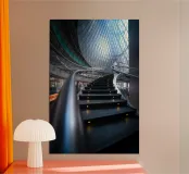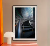 Le ringhiere metalliche tracciano la curva con fluida precisione, con un design robusto e raffinato, magari ornato da motivi ornamentali o mantenuto minimale e moderno. Freddo al tatto, il metallo brilla sottilmente, catturando la luce a ogni curva. Ogni gradino invita a salire, creando un senso di tranquilla attesa, come se la scala non conducesse semplicemente a un altro piano, ma a una storia che si svolge al di sopra.