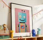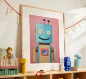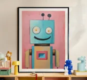 Ravvivate qualsiasi stanza con questo allegro robot da parete! Caratterizzato da un sorridente robot blu con uno sfondo rosa, questo disegno vivace e giocoso è perfetto per stimolare la gioia e la creatività. Esposta in una cameretta, in una stanza dei giochi o in un'aula scolastica, questa opera d'arte aggiunge un'atmosfera divertente e fantasiosa a qualsiasi spazio. Immaginate questo poster di un robot felice sulla parete di una cameretta giocosa, che illumina una classe o che ispira divertimento nell'angolo creativo di un bambino. I suoi colori vivaci e l'atmosfera allegra lo rendono un'aggiunta coinvolgente a qualsiasi spazio.