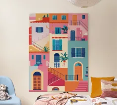 Una ripida scalinata colorata funge da strada in una città mediterranea, fiancheggiata da edifici di colore giallo, arancione e rosa, ornati da piante verdi in vaso.