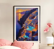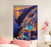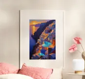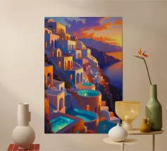 Questo dipinto accattivante ritrae l'incantevole bellezza di Santorini durante il crepuscolo, quando il cielo si trasforma in arancioni e viola profondi. Le case a schiera, illuminate da calde luci dorate, scendono a cascata lungo la scogliera, conducendo lo sguardo verso lo scintillante Mar Egeo. Le piscine a sfioro e le scale creano schemi fluidi che si armonizzano con le curve naturali della costa. Questo capolavoro è una celebrazione dell'architettura unica di Santorini e del magico gioco di luci, colori e paesaggi alla fine della giornata.