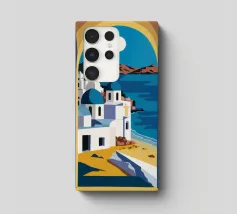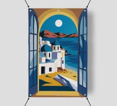 Una vista pittoresca dei classici edifici a cupola blu di un'isola greca come Santorini, visti da una finestra ad arco. Questa splendida scena cattura perfettamente il fascino idilliaco di una vacanza nel Mediterraneo.
