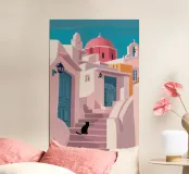 Un gatto nero si sofferma sugli iconici gradini imbiancati di Santorini, con la famosa chiesa a cupola rossa e il mare blu sullo sfondo, catturando un momento di pace della vita dell'isola greca.